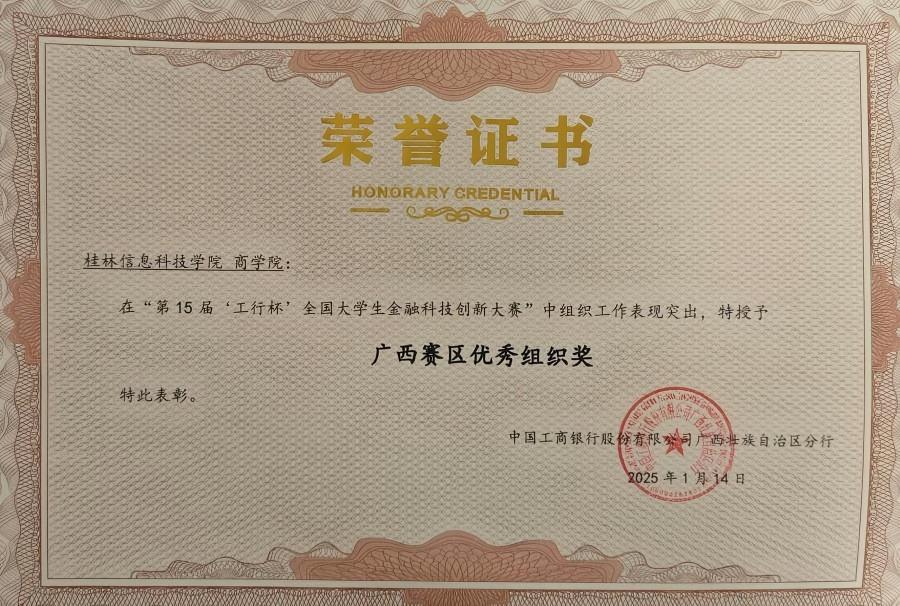 近日,第十五届“工行杯”全国大学生金融科技创新大赛广西赛区落幕。我院师生共组建56支队伍100余人次参加本次大赛。其中4支队伍荣获区级三等奖,我院荣获“广西赛区优秀组织奖”。