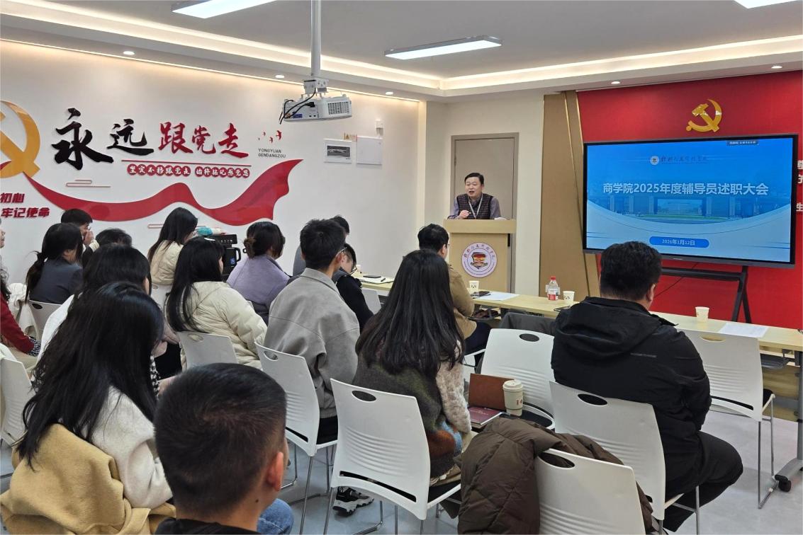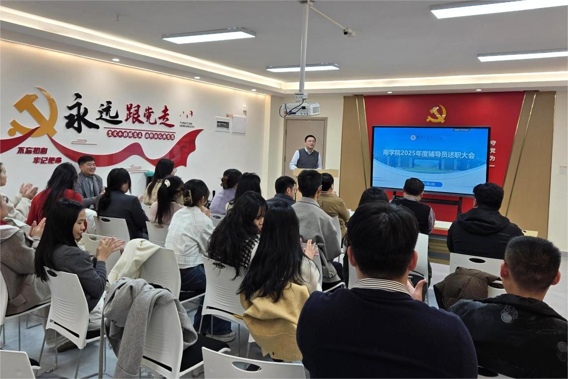 为全面总结年度学生工作成效,推进辅导员队伍专业化建设,1月12日,商学院在一站式服务中心党员活动室召开2025年度辅导员工作述职会议。学校纪委书记、校长助理周璇,学院院长周洁、学生发展与服务中心副主任蒋勇,学院全体辅导员参加会议。会议由学院党委书记许奇主持。