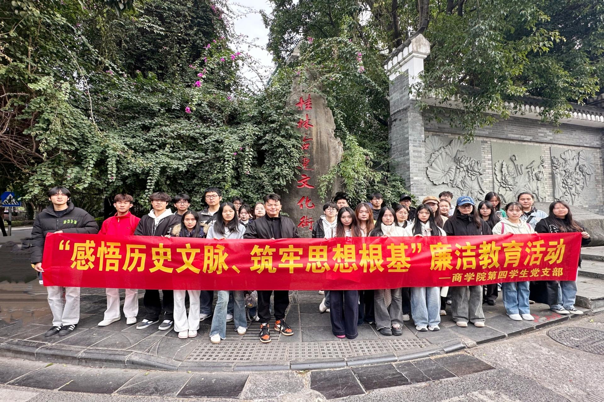 为加强廉洁文化建设,筑牢党员拒腐防变思想防线,11月30日,商学院党委组织师生党员前往桂林市七星区古莲文化街,开展“感悟历史文脉 筑牢思想根基”廉洁教育活动。