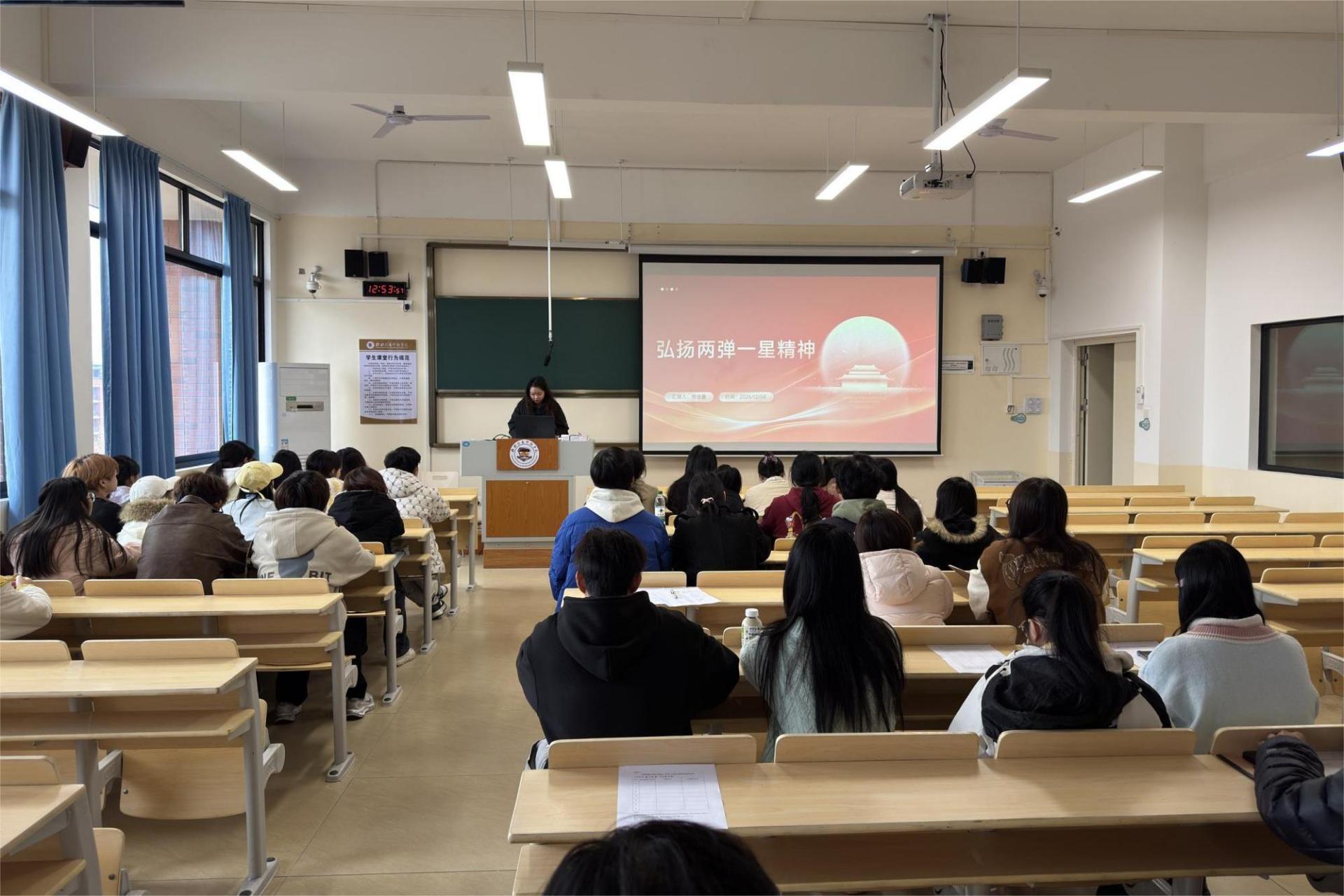 为推动“中国共产党人精神谱系”学习走深走实,引导青年群体从红色精神中汲取奋进力量,12月5日,商学院第一学生党支部在D406教室开展“传承‘两弹一星’精神,争做新时代青年先锋”主题宣讲活动。支部书记袁喆主持活动,支部党员、青年学生及团干代表共80余人参加。