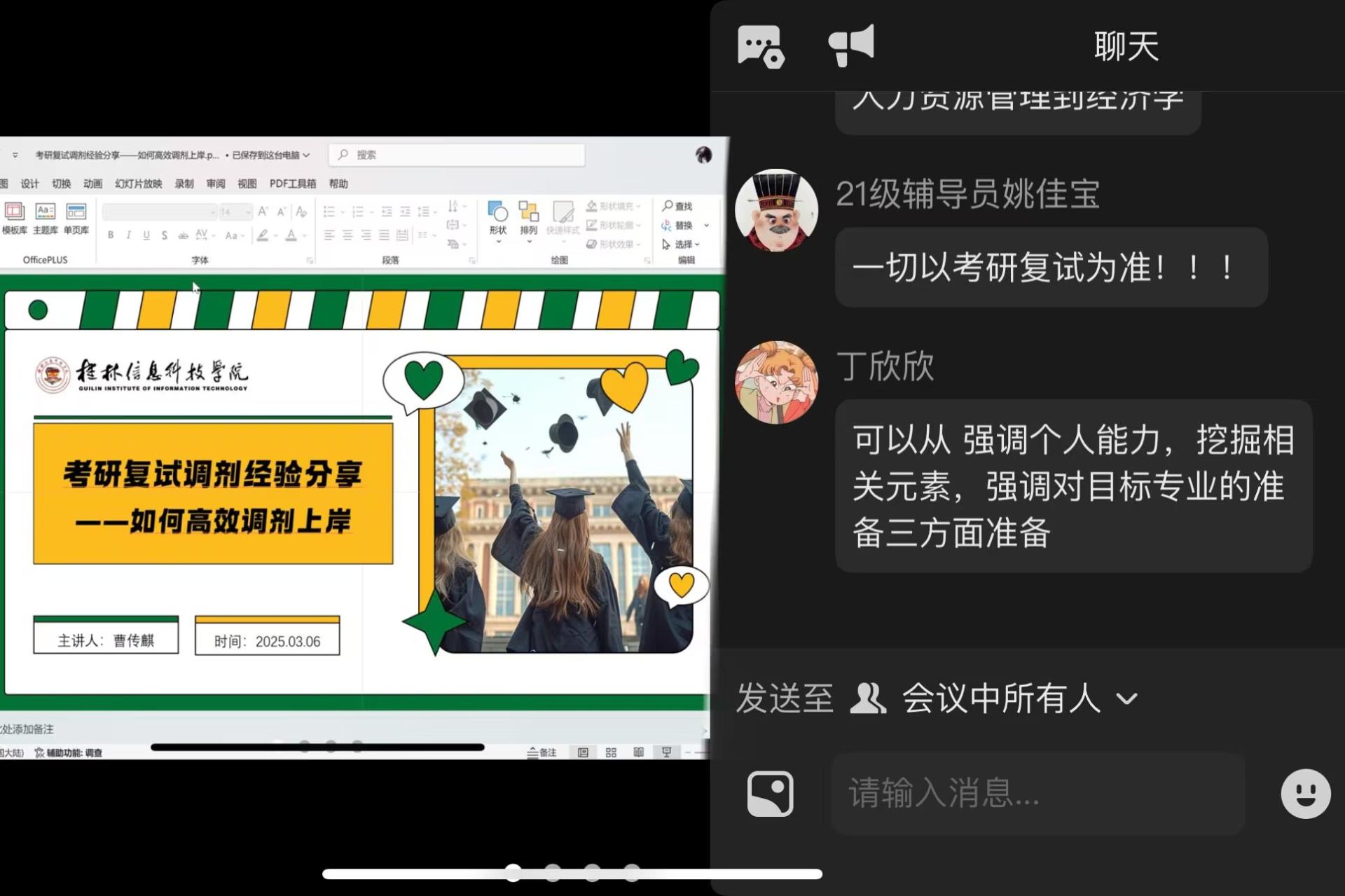 会上,丁欣欣老师聚焦流程规范,夯实备考细节,结合近年研究生招生政策变化,围绕复试流程、专业素养展示及面试礼仪展开系统讲解。她着重强调了提前准备材料的重要性,并鼓励大家在面试中展现清晰的逻辑思维与专业应答能力。曹传麒老师科学规划调剂,把握关键节点,从调剂政策解读、信息筛选技巧和院校梯度选择三方面提出建议。她深入解析了调剂策略,提醒学生密切关注调剂信息,优先选择相近专业院校,并主动沟通提升成功率。互动交流环节,同学们就跨专业调剂、面试技巧、复试时间冲突等问题踊跃提问,老师们结合往届典型案例逐一解答,并建议考生通过模拟面试、心理调适等方式缓解焦虑。
