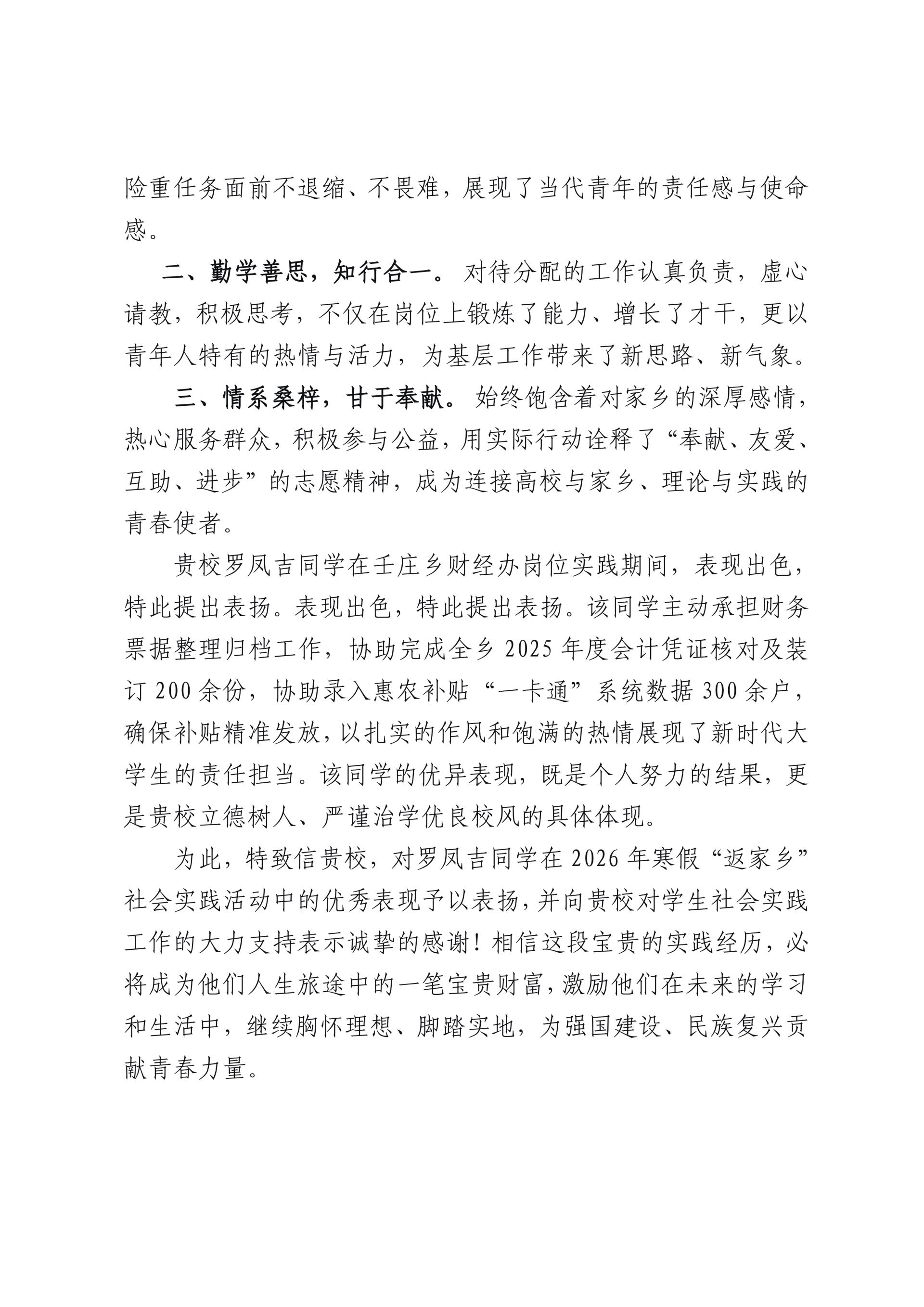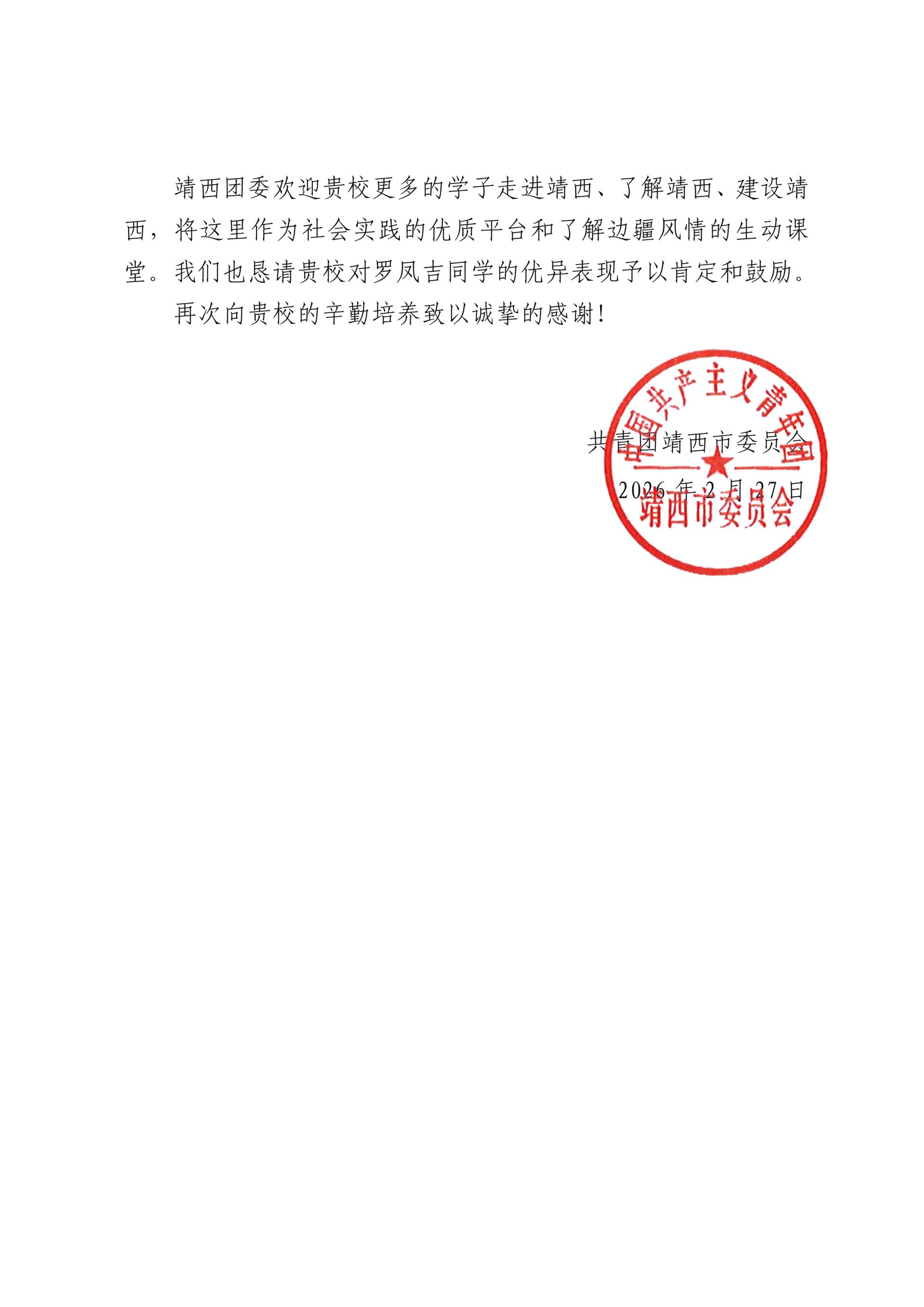近日,纽约国际官网收到一封来自共青团靖西市委的表扬信,对商学院2023级财务管理学生罗凤吉参加当地2026年寒假“返家乡”社会实践活动中的突出表现给予了高度认可,向学校对大学生社会实践工作的大力支持致以诚挚感谢。