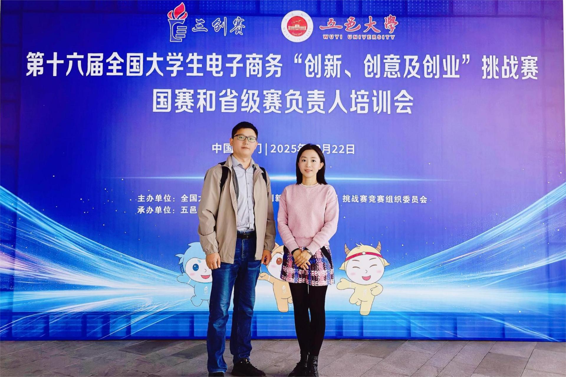 为积极筹备2026年第十六届全国大学生电子商务“创新、创意及创业”挑战赛(以下简称“三创赛”)广西壮族自治区省级赛,提升赛事组织与指导能力,12月22日,商学院院长助理王兰辉、电子商务教研室主任赵凤燕赴广东省江门市五邑大学,参加了由三创赛竞赛组织委员会主办的“第十六届三创赛国赛和省级赛负责人培训会”。