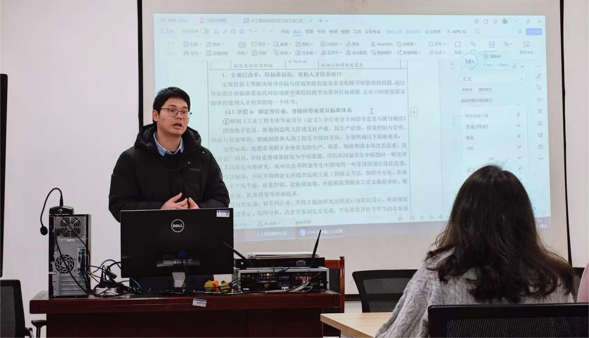 戴欧阳老师首先介绍了当前工业工程专业在人工智能背景下推进的产教融合专业建设改革工作。他结合项目申请书的撰写情况,重点就“改革对策”部分与各位教师进行了深入交流。工业工程教师结合自身教学经验和行业认知,积极发表意见,围绕毕业论文、课程体系优化、企业合作模式、实践教学平台建设等方面提出了多项建设性建议,为进一步完善专业改革方案提供了有力支持。