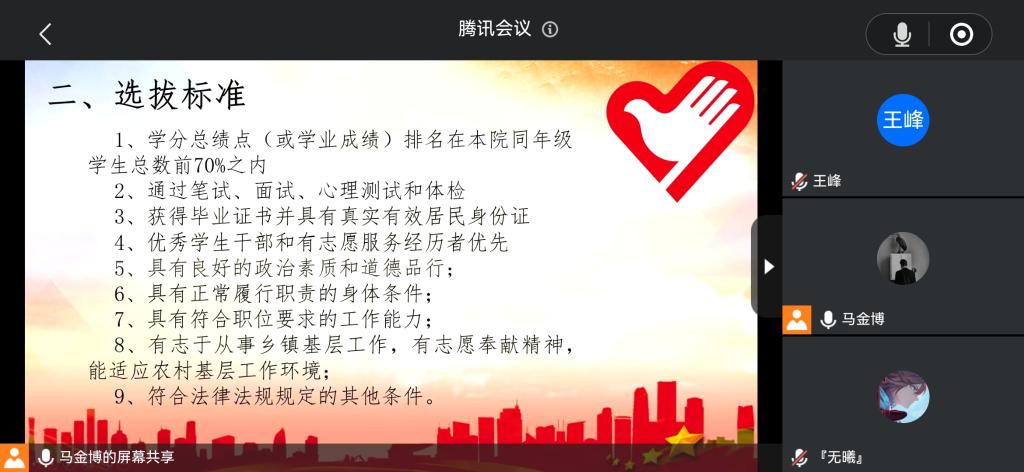 为进一步做好我院2024年西部计划的宣传动员工作,弘扬“奉献、友爱、互助、进步”志愿服务精神,引领新时代青年到祖国需要的地方建功立业,4月8日,商学院开展2024年大学生志愿服务西部计划宣讲会。宣讲会以线上形式进行,学院团委书记马金博、毕业班辅导员及全体应届毕业生参会。