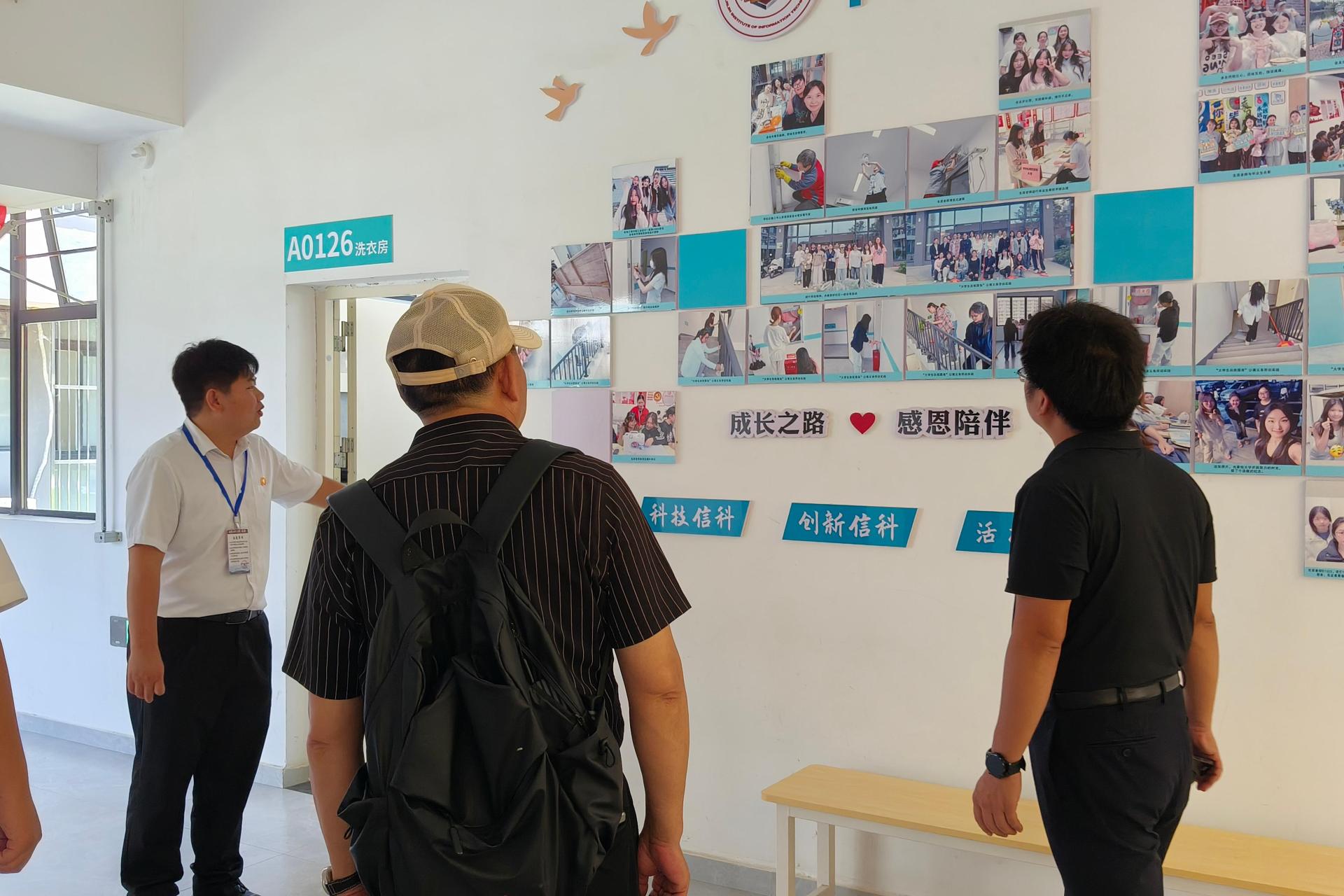 走进新生宿舍,领导班子成员与新生及家长亲切交谈,同时耐心倾听大家的需求与困惑。院长王家年细致询问新生们的住宿适应情况、行李物品是否齐全、饮食是否习惯等生活问题,并表示遇到困难要及时与辅导员沟通;学院党委书记李刚则着重强调了集体生活中的团结互助,提醒新生们注意宿舍用电安全与个人财物保管;副院长赖安与学工办主任杨锦超引导师生驻足“至善之星” 荣誉墙前,介绍该板块定期围绕志愿服务、学业帮扶、社区服务等方向,以光荣榜的形式传递正向力量。辅导员们也全程陪同,记录新生需求,为后续精准服务做好准备。