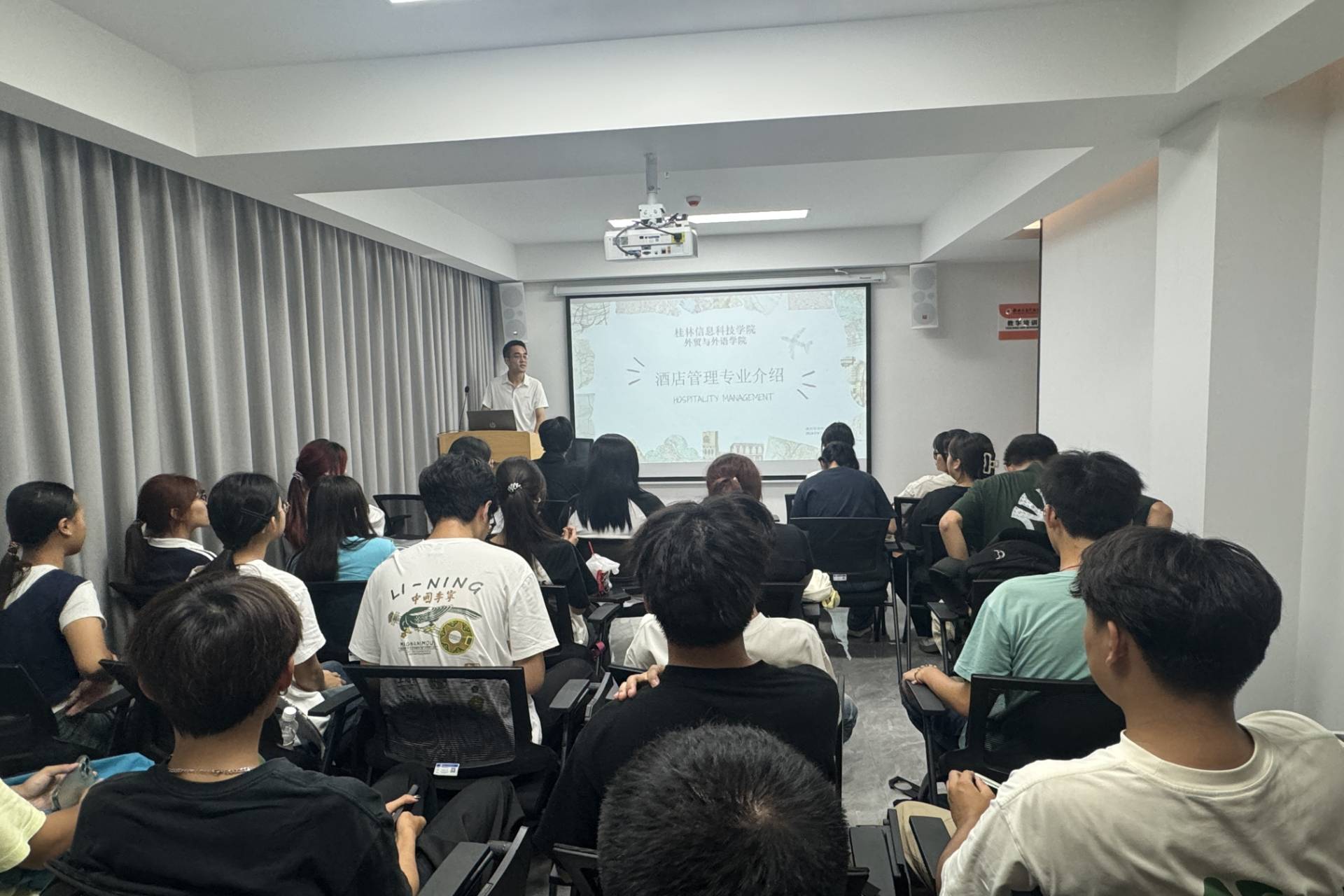 为帮助2025届酒店管理专业新生快速了解专业定位、明晰学习方向、合理规划大学成长路径,2025年10月11日上午,外贸与外语学院酒店管理专业教研室在酒店管理综合实训实验室为新生们开展了一场内容详实、重点突出的专业介绍会。本次介绍会由酒店管理专业教研室副主任冯文雄老师主讲,2025届酒店管理专业新生全程参与。