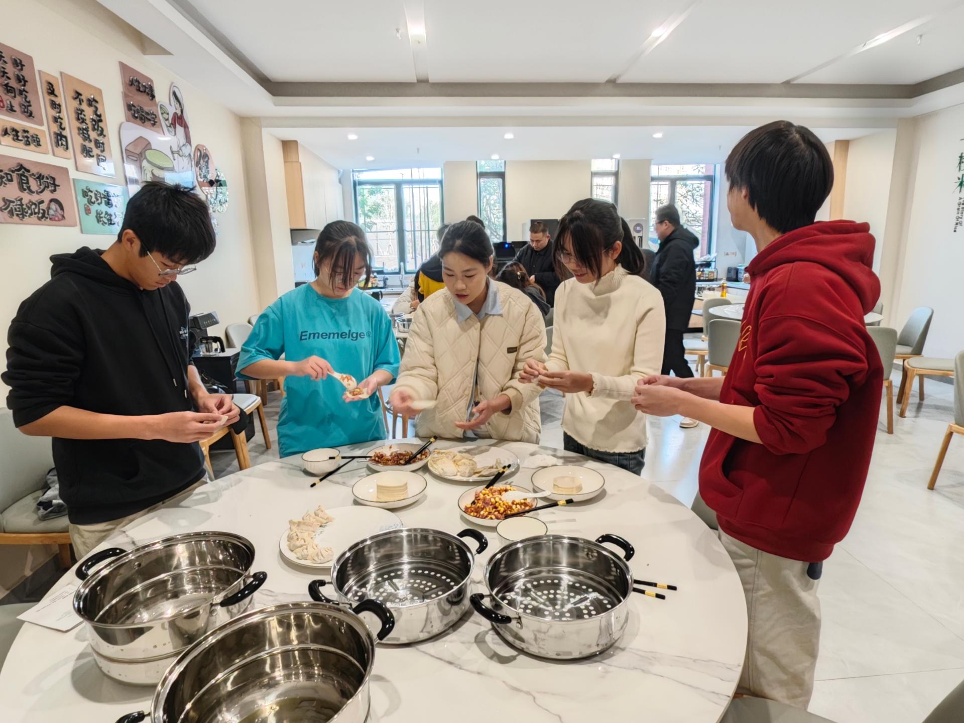12月20日上午,学生发展与服务中心组织师生在一站式学生服务中心共享厨房进行“包饺子”活动。包饺子的过程中,老师与同学们一边包着饺子,一边交流着各地冬至不同的风俗习惯,场面一番其乐融融的景象。