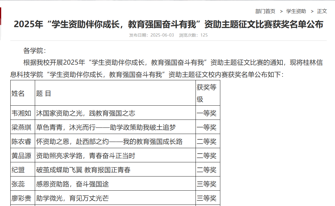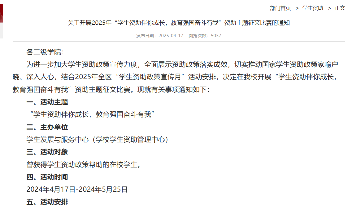学校学生资助管理中心组织举办“学生资助伴你成长,教育强国奋斗有我”资助主题征文比赛,最终推选两部优秀作品至自治区参赛。