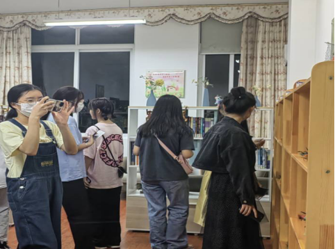伴随着向导对朋辈工作室的讲解中,同学们可以通过工作室中那一小片照片墙看到心理协会的伙伴们的快乐工作氛围。看着那满柜心理健康的书籍,不少对心理知识充满兴趣的同学情不自禁拿下几本书来细细翻阅。