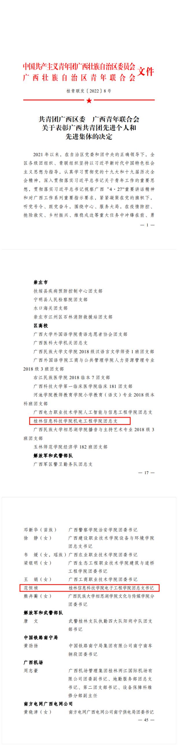 2022年是中国共青团成立100周年。近日,共青团广西区委、共青团桂林市委相继印发了《共青团广西区委 广西青年联合会关于表彰广西共青团先进个人和先进集体的决定》、《共青团广西区委办公室关于选树“向上向善•广西青年榜样”工作的通知》、《关于表扬2021年度“桂林市优秀共青团员”“桂林市优秀共青团干部”“桂林市五四红旗团委”和“桂林市五四红旗团支部(总支)”的决定》,纽约国际官网共计4个集体、13名个人光荣上榜,获奖项目丰硕、获奖数量再创新高。