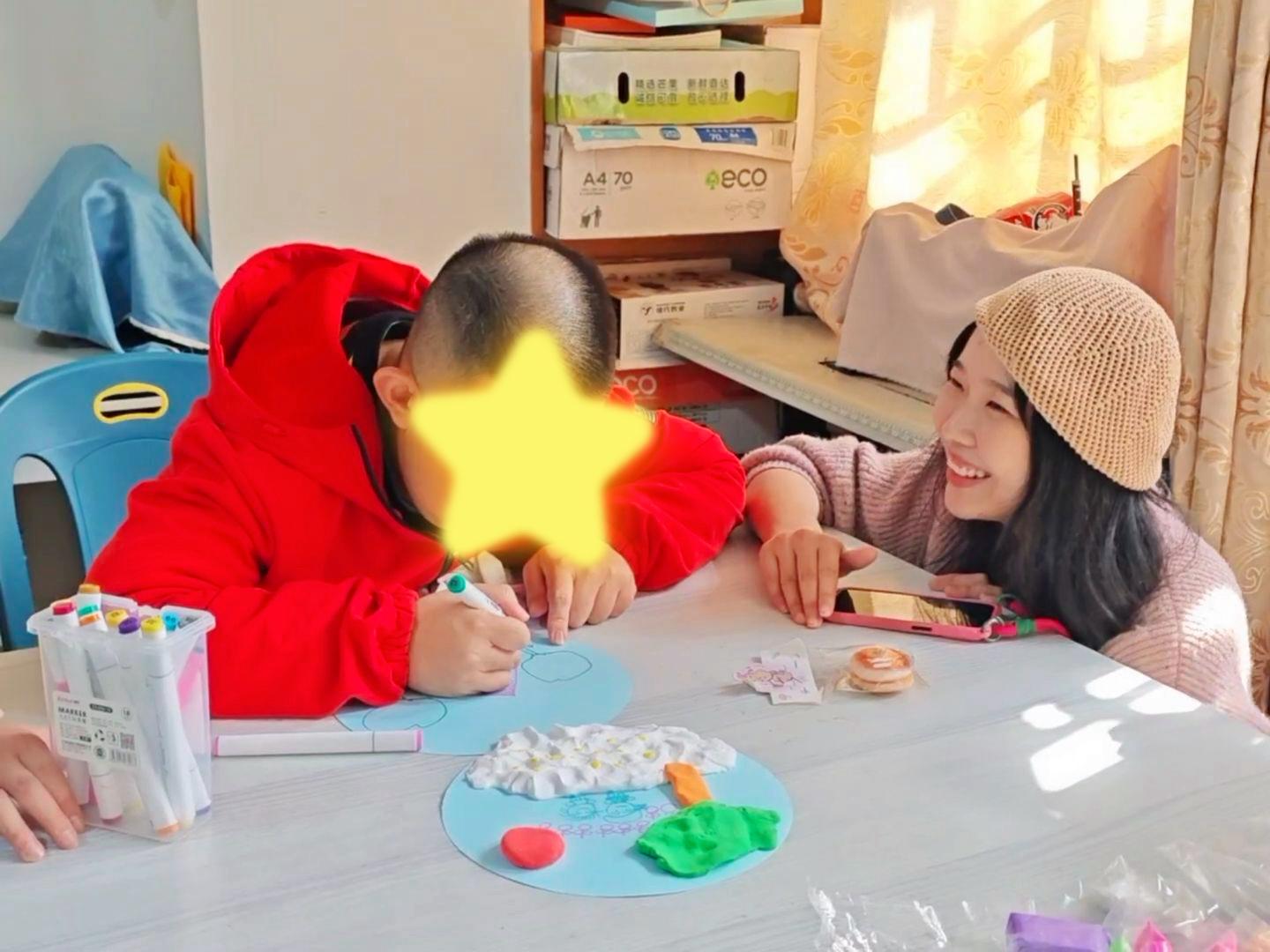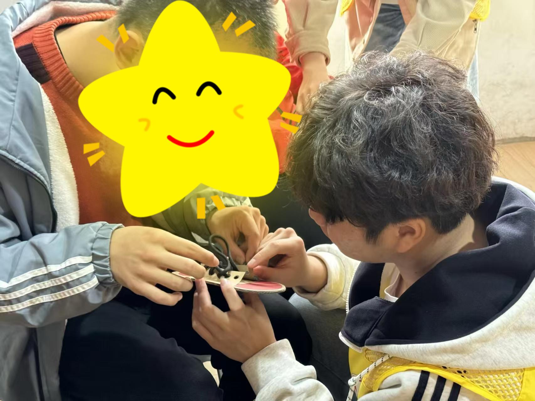 活动当天,志愿者们迅速分工,用雪花片、气球、主题挂布等精心布置场地,营造出温馨欢快的氛围。在熟悉 “心” 朋友们的喜好与需求后,活动于上午 9 点 40 分正式拉开帷幕。活动精心设计了四大实践环节。“系鞋带”游戏中,“心”朋友们手持鞋子卡片和鞋带,在志愿者一对一或小组引导下尝试穿绳、打结,在解锁基础技能的过程中积累自信与勇气;“模拟购物”环节里,大家化身小顾客,手持练功券与志愿者扮演的店员互动,完整体验问价、付款、找零流程,在趣味交易中提升社会适应力与沟通力;“模拟过马路”游戏中,志愿者通过红绿灯演示装置模拟真实交通场景,引导“心”朋友们识别信号、判断通行,筑牢独立出行的安全防线;“冬日风景画”创作环节,圆卡纸、马克笔、粘土与纸巾巧妙结合,大家尽情发挥创意,在动手创作中舒缓身心、收获满满成就感。每个环节都有志愿者全程耐心陪伴与指导,及时给予鼓励与支持,整个活动现场洋溢着温暖与欢乐的氛围。
