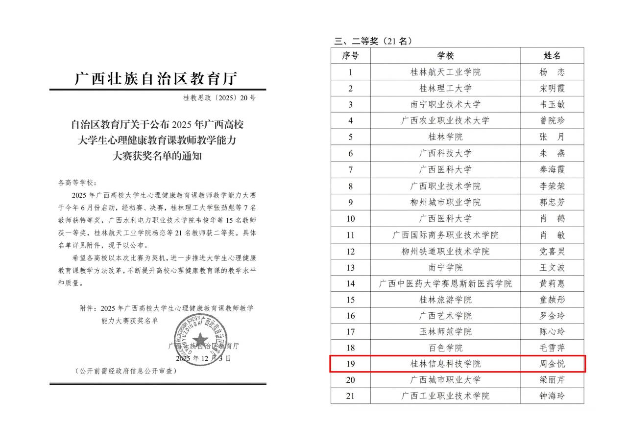 近日,自治区教育厅发布《关于公布2025年广西高校大学生心理健康教育课教师教学能力大赛获奖名单的通知》(桂教思政〔2025〕20号),纽约国际官网创意设计学院辅导员周金悦在比赛中表现突出,荣获二等奖。
