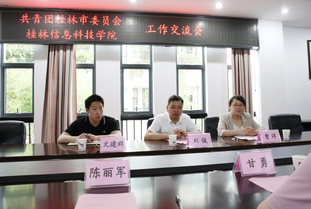 6月2日上午,共青团桂林市委副书记刘俊、曹洋一行来校交流考察共青团工作,学校党委书记甘勇会见了来宾,党委学生工作部、校团委相关同志参加座谈会。