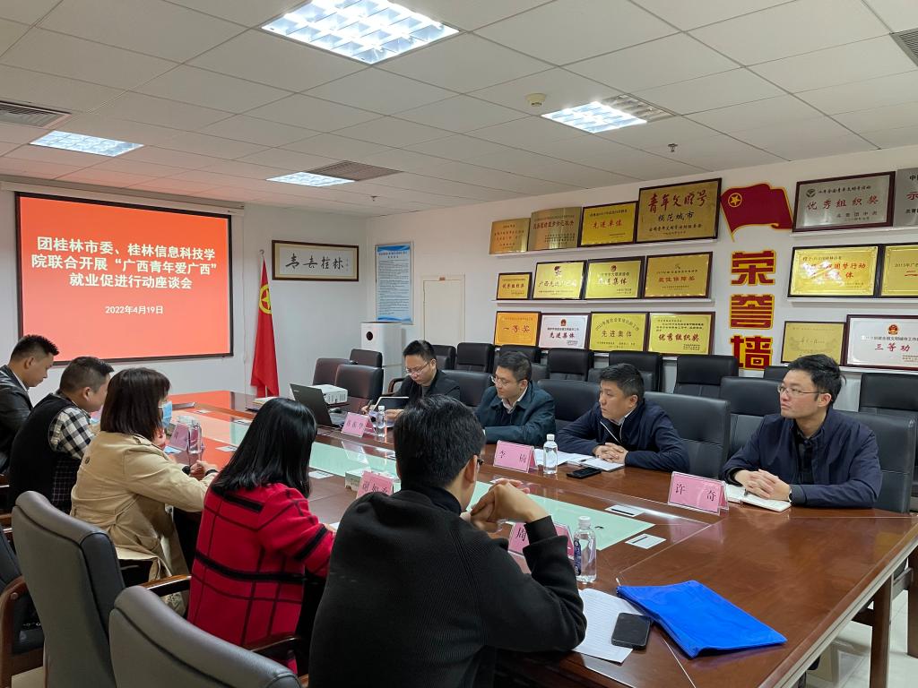 4月19日,学校招生就业处、学生工作部一行5人到共青团桂林市委开展“广西青年爱广西”就业促进行动座谈会,共青团桂林市委副书记蒋杨桦及相关部门负责人参加了会议。