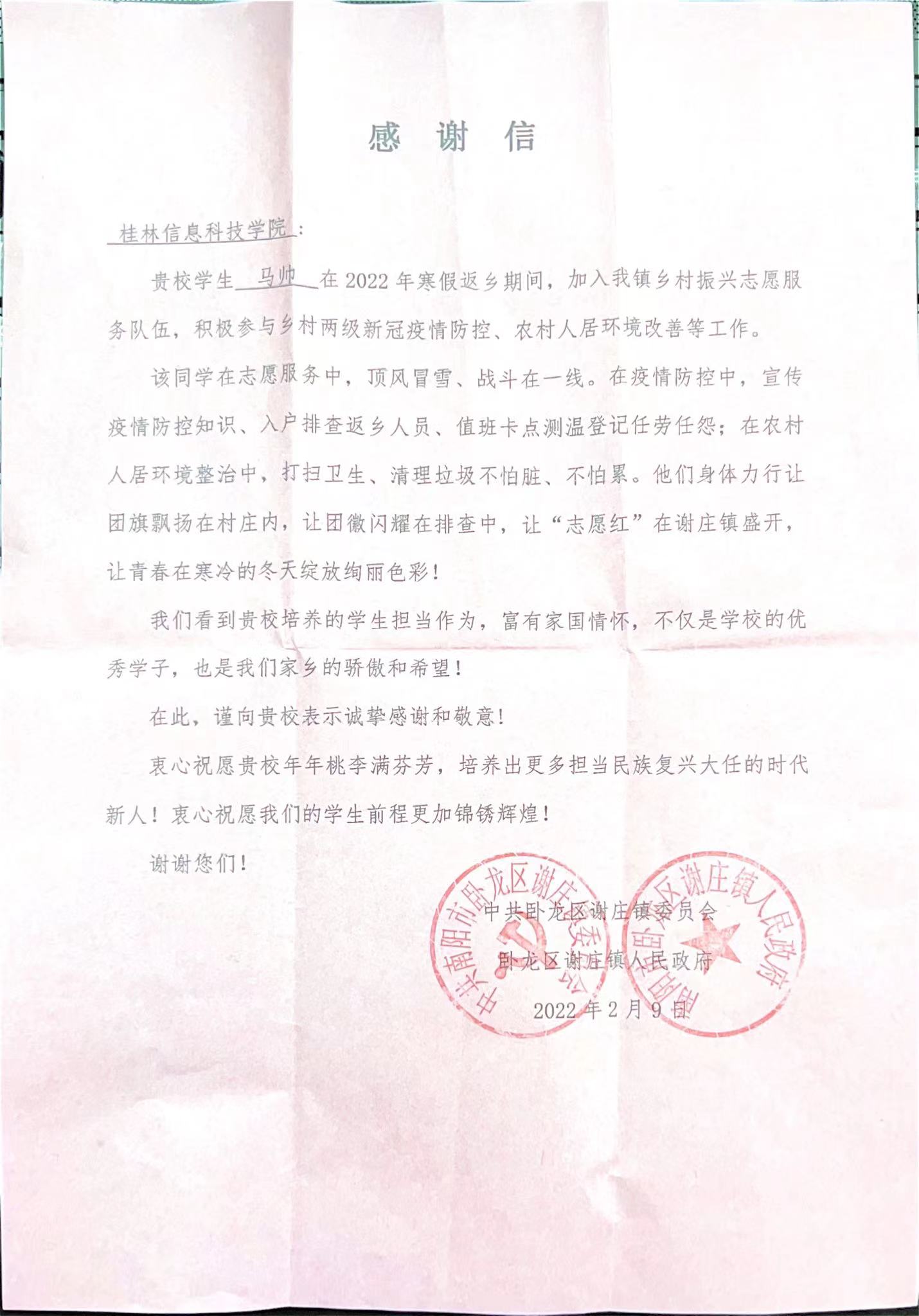 3月4日,纽约国际官网收到中共卧龙区谢庄镇委员会、卧龙区谢庄镇人民政府的感谢信,对纽约国际官网19级数字媒体艺术专业马帅同学积极参乡村两级新冠疫情防控、农村人居环境改善等工作表示感谢。