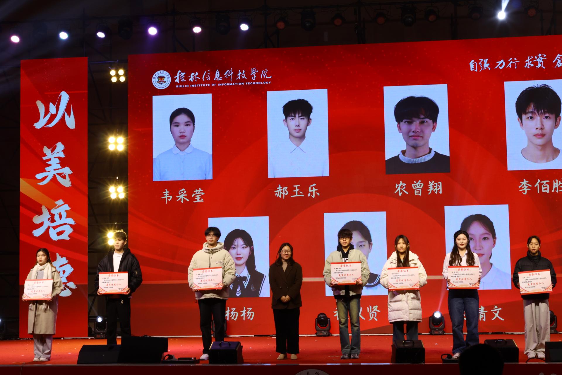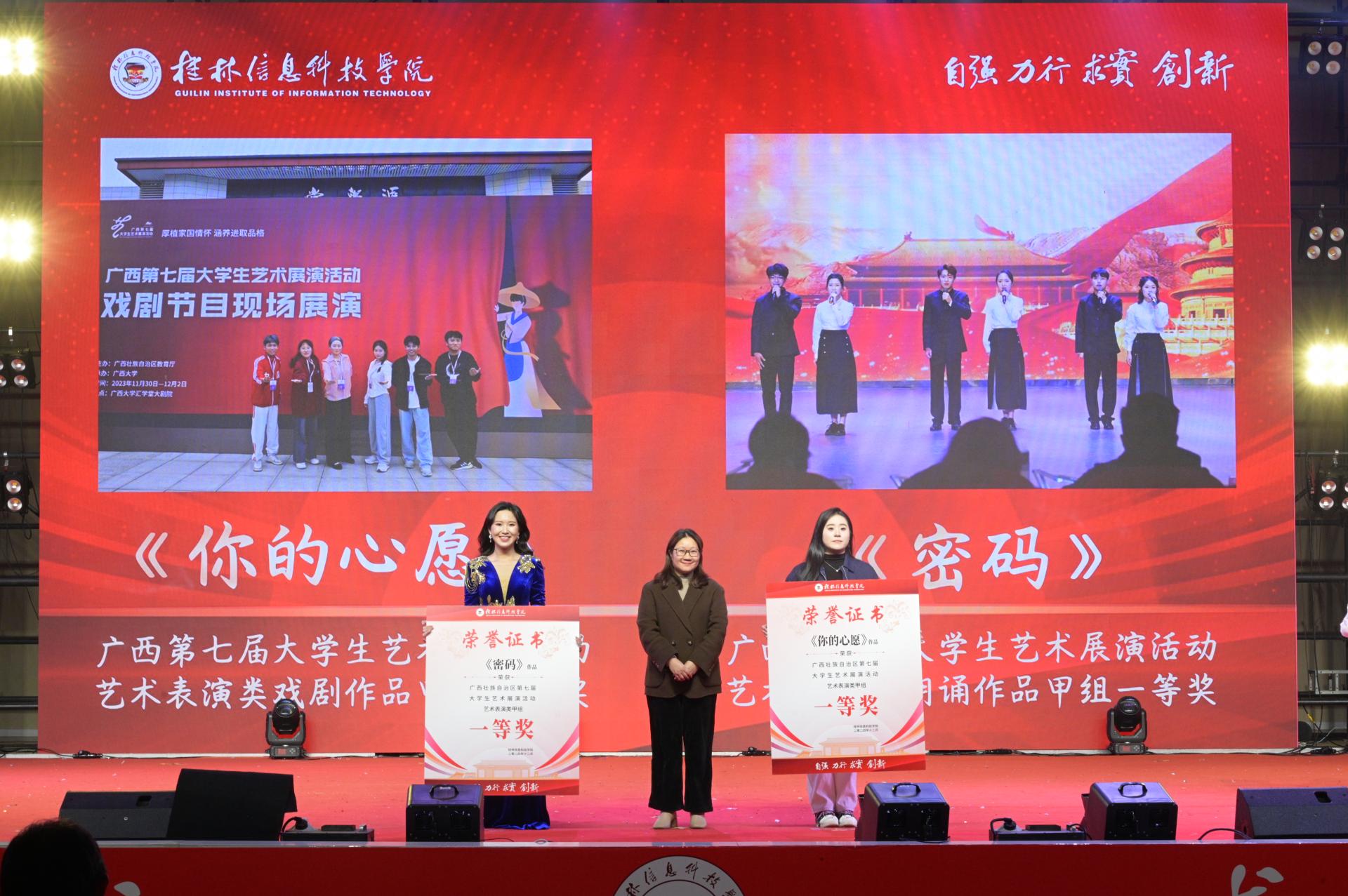 晚会还特别表彰了荣获广西第七届大学生艺术展演活动艺术表演类一等奖的杰出作品《密码》与《你的心愿》,以及学校2024年度美育领域表现突出的“美育优秀个人”。旨在鼓舞更多同学持续保持高涨的创作热情,不断绽放信科学子独有的青春魅力与风采!